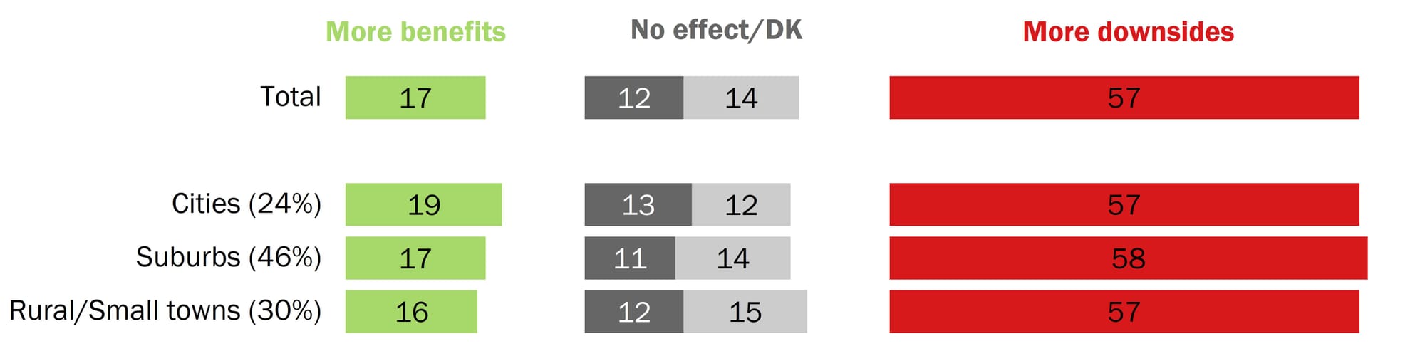 Interestingly, despite the large political divides in Colorado by rural and urban areas, views of data centers are largely unrelated to community type. People living in cities, suburbs, and rural areas or small towns were all equally likely to say they see more downsides to data center construction than benefits.