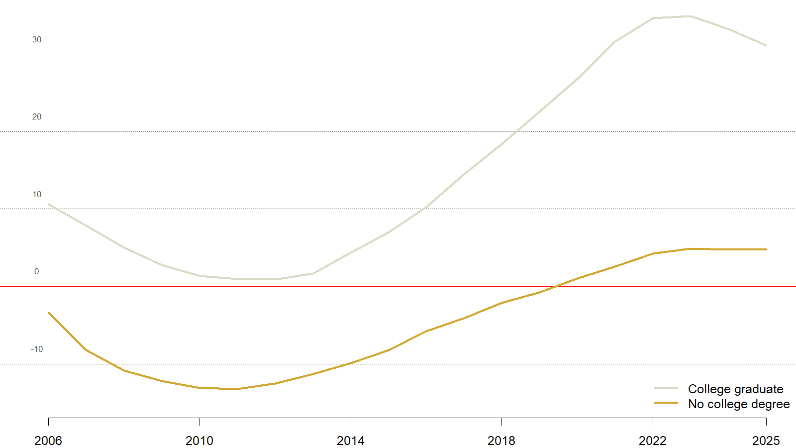 Democratic advantage among White Coloradans by education, 2006-2025