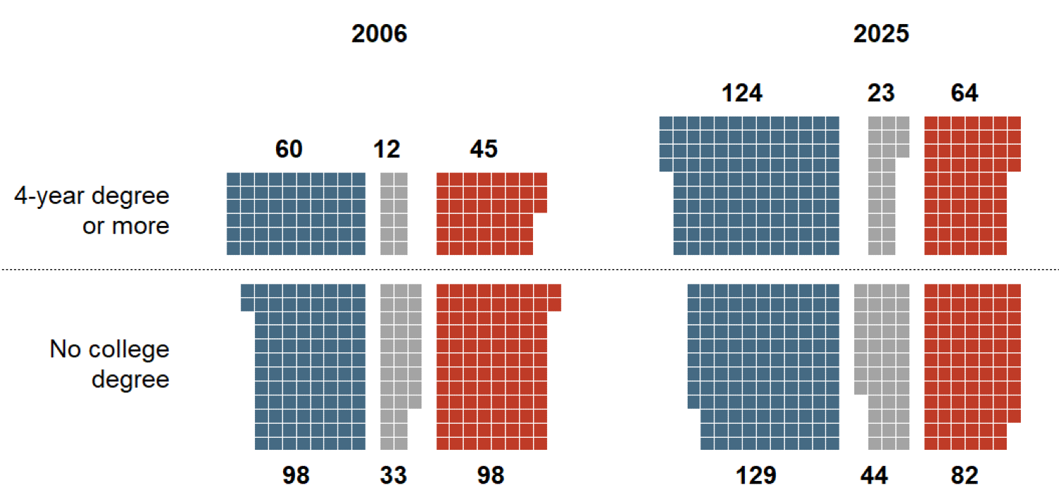 The figure below represents the Colorado public at two points in time (2006 and 2025). To understand the dynamics of partisanship over time, we have to account simultaneously for the changing composition of the population (increasing shares with a college degree and a growing population overall), and the changing relationship between education and partisanship (the gains Democrats have made among those with and without a college degree). Each square in the chart below represents 10,000 Coloradans, and they are organized into educational and partisan groupings.