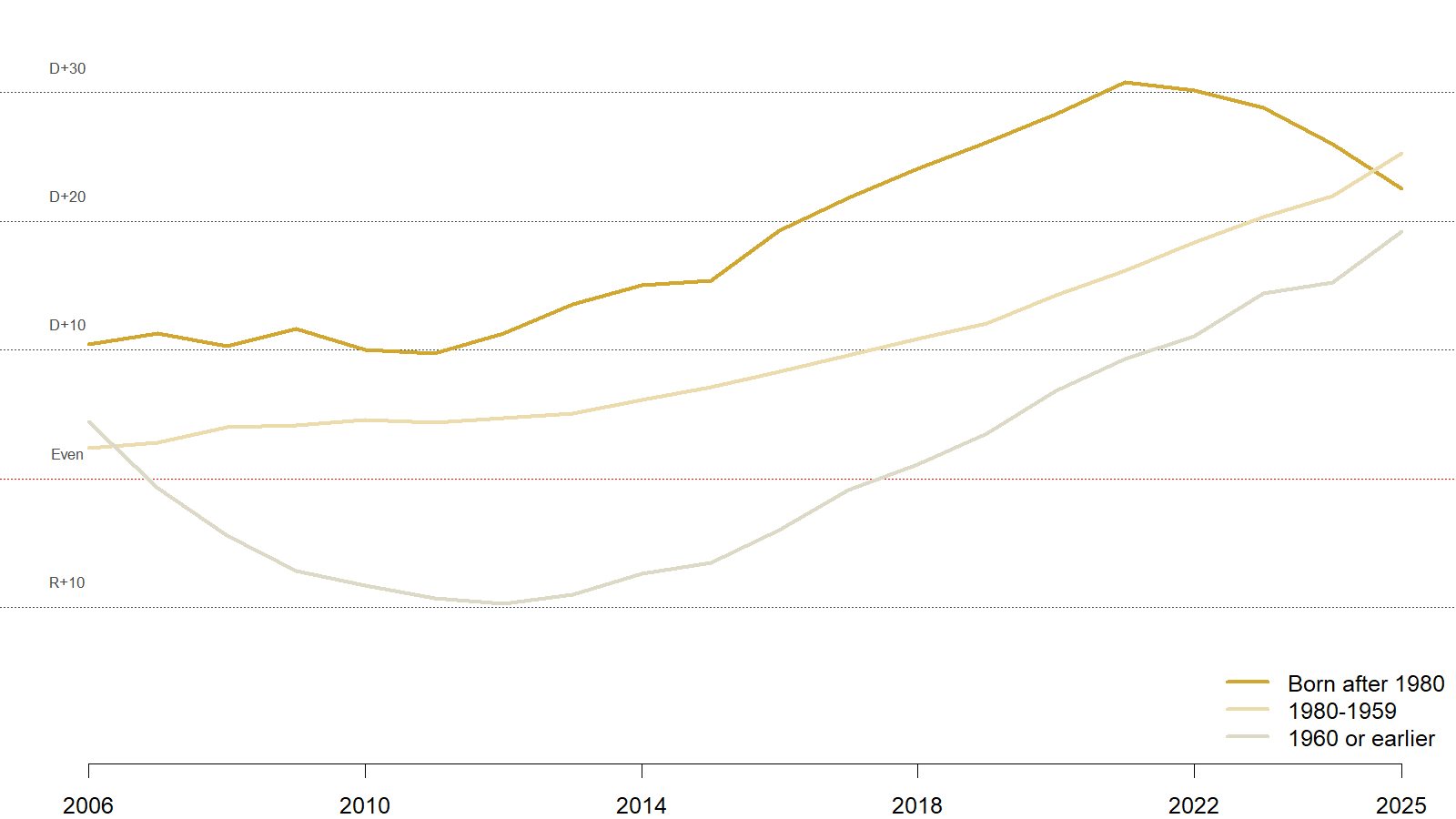 When looking at the overall balance of partisanship, the generational gap in Colorado has mostly closed. Today, all three groups are about 20 percentage points more Democratic than they are Republican. During most of the period under consideration, there were significant generational gaps in partisan balance.