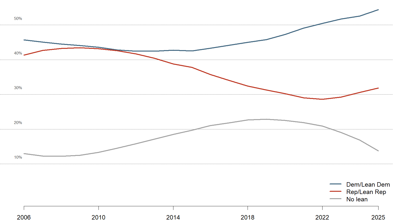Republican identification in the general public declined substantially during the first Trump administration. This was accompanied by a large increase in the share of Coloradans who say they don't have any partisan leaning. There is some indication that those trends started to reverse during the Biden administration with a slight uptick in the share of Coloradans who identify or lean toward the Republican Party and a concomitant decrease in the share who say they have no affiliation.