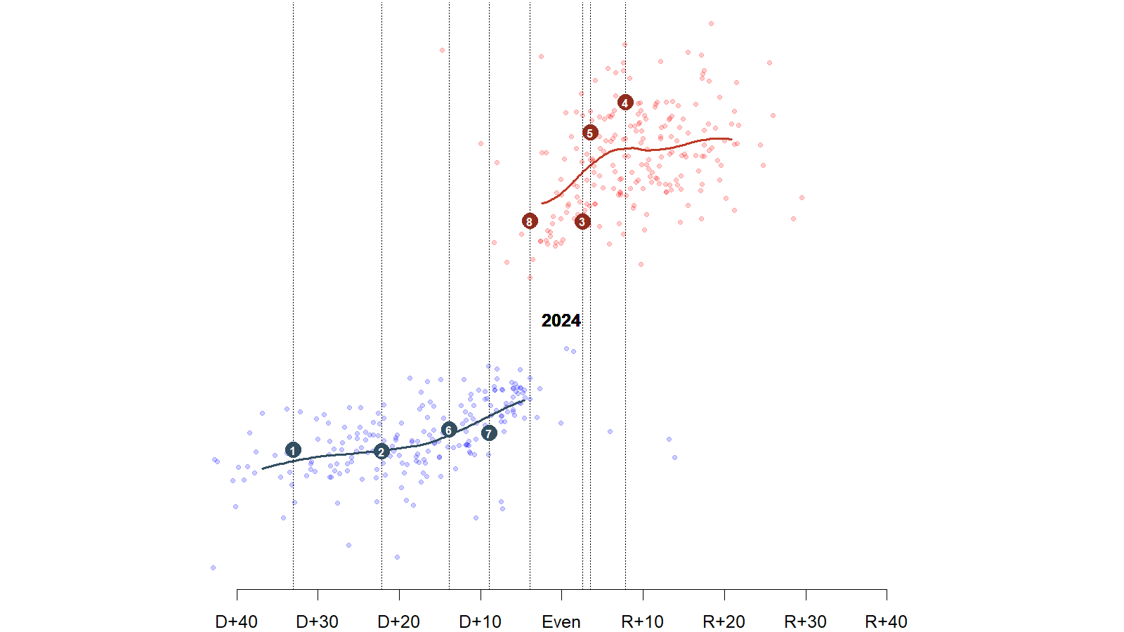 One concept political scientists use to understand polarization is "intradistrict divergence." This is a jargony way of talking about the gap (observed or, more often, expected) between legislators who represent the same constituency. Except for the case of Senators (and some historical multimember districts prior to the passage of the Uniform Congressional District Act in 1967), we don't actually see the same constituency being represented by members from different parties at the same time which is the most straightforward way to see the partisan gap.