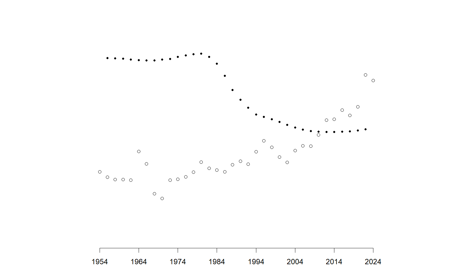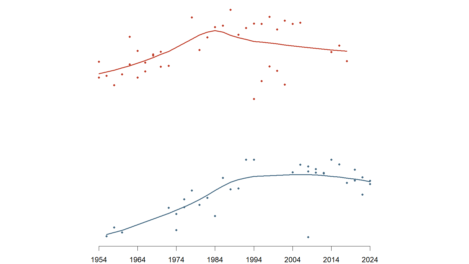 Estimated partisan gap between senators representing the same states, 1954-2024