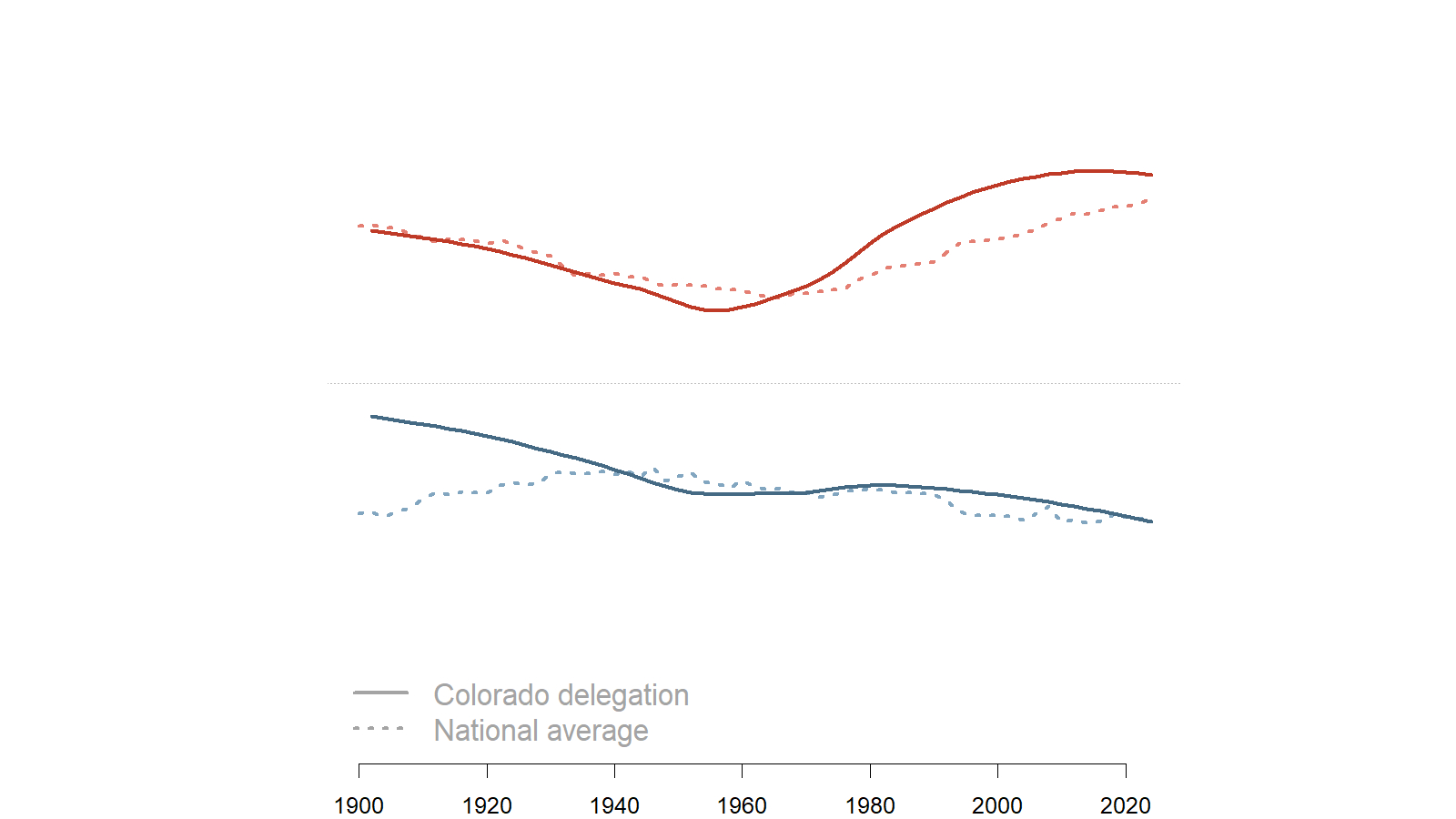 Average ideological placement of the two major parties by chamber (DW-NOMINATE), Colorado delegation, 1900-2024