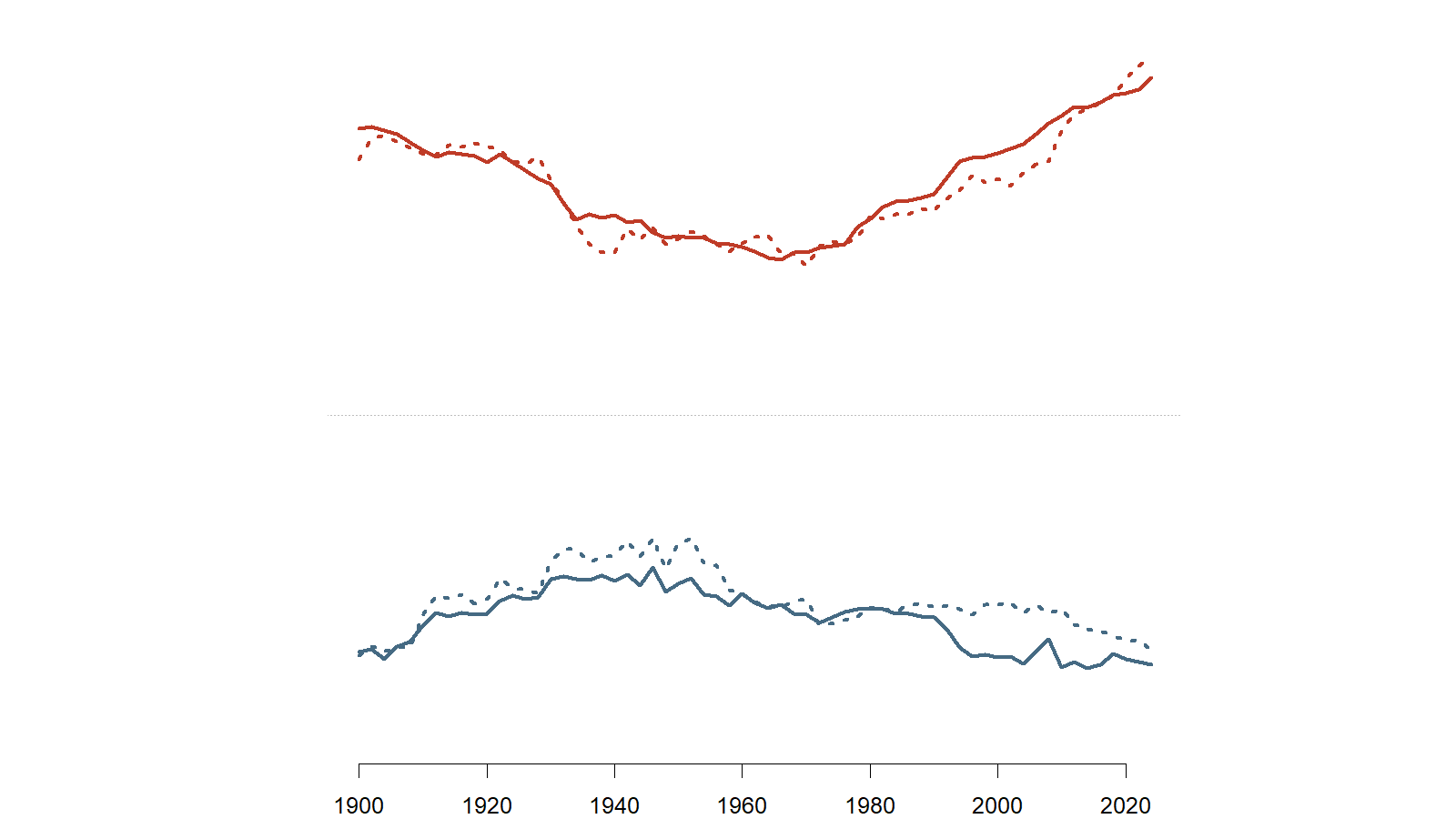 Average ideological placement of the two major parties by chamber (DW-NOMINATE), 1900-2024