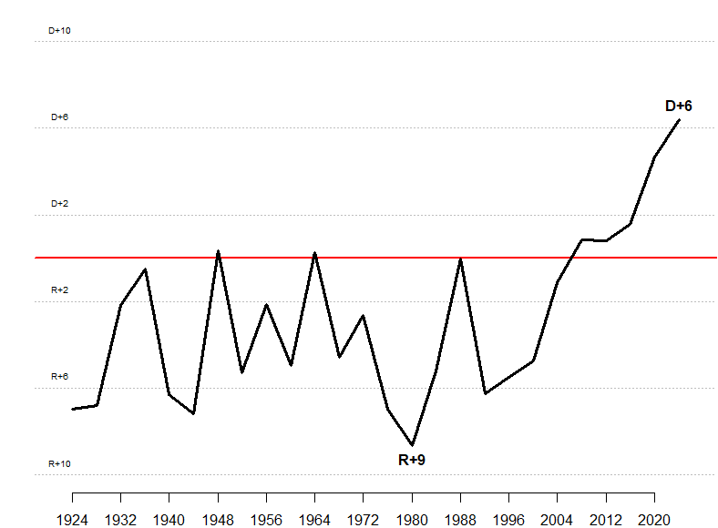 The focus on the difference from the national average controls in some measure for national swings. Presidential elections have generally been characterized by uniform swings across all states. We saw this once again in Trump's victory in 2024. (Nearly) every state swung toward the Republican Party in 2024 compared to their support for Trump in the 2020 election. For more, see this old post of mine on (the now defunct) CivilPolitics.