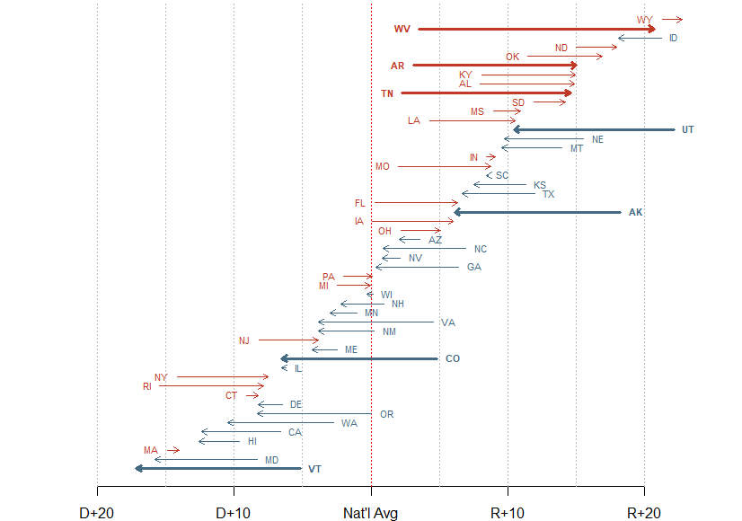 I don't know much about Alaska politics apart from their moderate-ish senior senator. The Utah shift seems to be more driven more by an anti-Trump sentiment. Both states remain very Republican leaning. Vermont started blue and has just become bluer, while Colorado has shifted from a reliably Republican state to a reliably Democratic one.