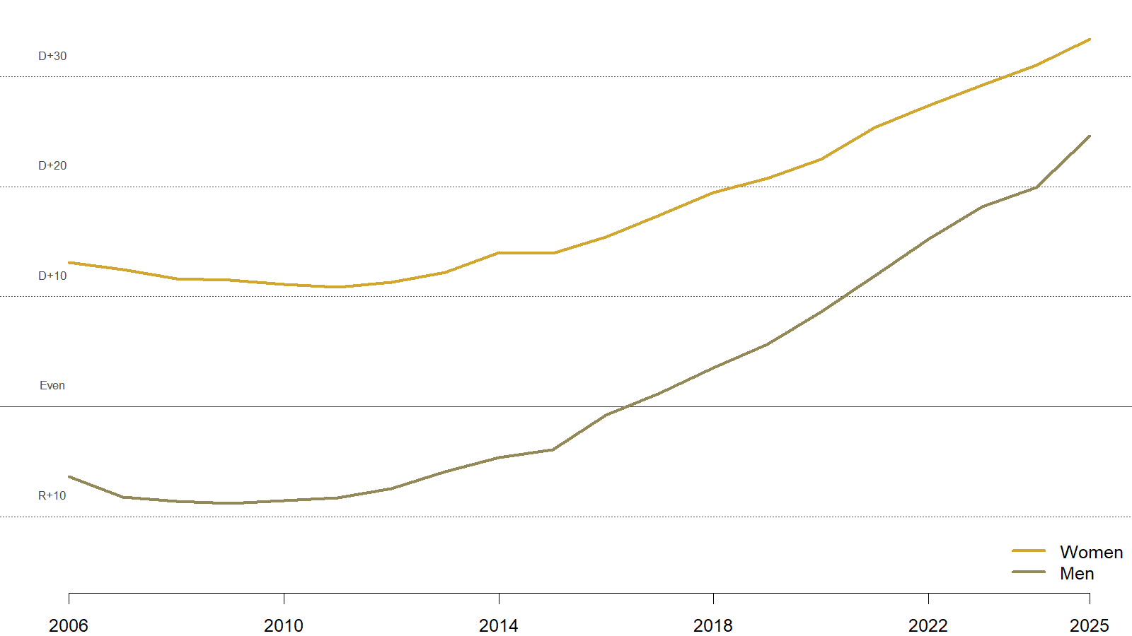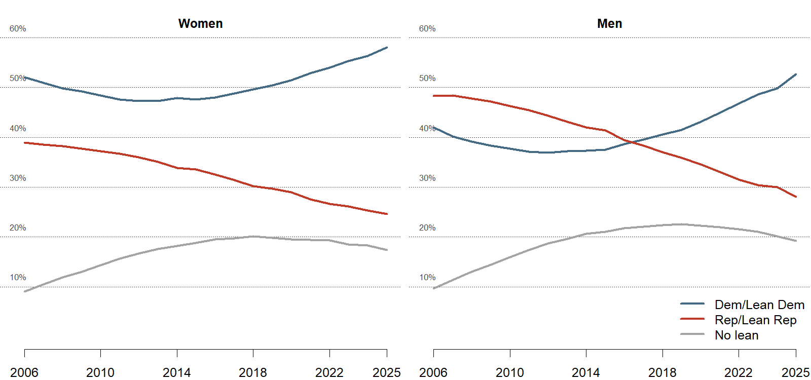 The partisan trajectories of men and women in Colorado have followed roughly parallel paths. After a slight downward trend in the mid-2000s and early-2010s, men and women both started moving in a more Democratic direction. During this same period, the shares of both men and women who identify or lean toward the Republican Party have declined at a steady pace. During the first decade of this time series, there was also a roughly equal increase among men and women in the share who say they have no partisan affinity.
